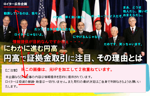 もう少し、調べてから書こうと思ったのですが、WR6月1日号がそろそろ公開されますので、優先順位の問題で加工した画像だけをアップしてしまいます。グダグダ言わずとも画像だけで話が通じるような気もしますが、別にロイター通信社に悪意があるわけではありません。ロイターが“世界の出来事は少数の通信社に集められ、リライトされ、我々のために配信される”金融筋御用達の通信社でないことは、かさねがさね、心から承知しておりますが、さらに良く承知するために、少しくらい調査しても良いはずです。