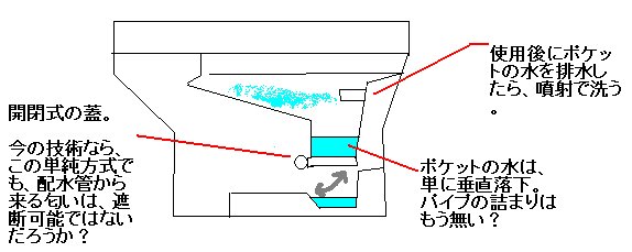 もし配水管のニオイを遮断できるなら、ポケットにずっと水を入れっぱなしでなくとも良くなりますね。そうなると、便座に座ってから水を溜めても良い事になります。まあ、便座に座る前でも、座った後でも、大した違いは無いかも知れませんが、配水管のニオイの遮断が出来れば、蓋の精度は水をずっと溜めておける程は要らないと思います。